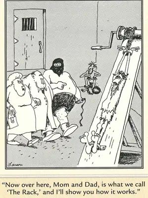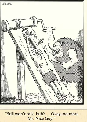 Bet šajā karikatūrā spīdzināšana jau sasniedz mērķi. Acīmredzot spīdzināšanas policijas ikdienas dzīve nav nekas, jo upuris jau ir sasietis plauktu, piespiedis nazi ap ķermeni, un vīrieša raksturs dzied ar lukturīti. Tas ir biedējoši, jo tas ir smieklīgi. Populārā tehnoloģija, kas bieži izmanto Geriju Larsonu Noņemiet sānu . Es pat nevaru iedomāties, cik nežēlīga ir nepareiza policija.