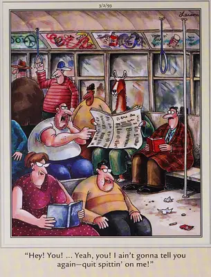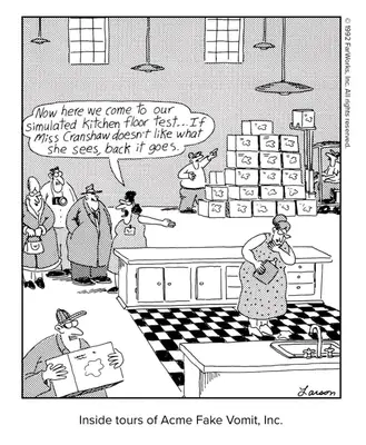 Varbūt Gerijs Larsons ir secinājis, ka viņš ir bijis atkarīgs no vemšanas. Apvidū Īsta vai slikta vemšana, Noņemiet sānu Man bija ko teikt. Šis ir vēl viens traks vemšanas piemērs Larsonā. Viņš meklē, kā Acme Corporation pārdod nepatiesu vemšanu. Viltus vemšanas, kas sasniedza tirgu, panākumi, iespējams, balstījās uz Klannshaw pleciem, kuri patiesības un kopējo faktoru dēļ meklēja nepatiesu vemšanu. Tas darbojas, ja Miss Klanshaw nepatīk viņu redzēt. Tas ir tūristu līderis.