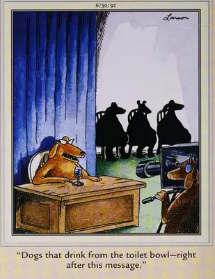 acīmredzams, Tā ir arī problēma, ka suņi vērtē viens otru. Kāpēc vannas istabas dzērājs ir anonīmi anonīms šī ziņu raksta ēnā? Tā ir viena no visinteresantākajām perforētajām līnijām, kuras pamatā ir Gerija Larsona izgatavotie suņi, upurējot labāko draugu.