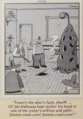 Gary Larson v minulosti navrhl některé nepříjemné karikatury, ale v mnoha případech jsou nejoblíbenější nejvíce nechutný význam než grafické obrazy. V tomto speciálním komiksu se zdá, že pouze obrázky jsou docela mírné. Když je však název přidán, trapná realita je jasná. Kolēģis stādīja mirušu centru uz citas sviestmaizes. Un viņš nolēma man pateikt, kā viņai klājas. Šajā kontekstā lasītājam jāievieš nepatīkams centrs starp abiem gabaliņiem.