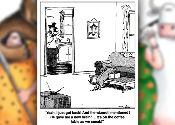 Pārsteidzoši, ka Gerijam Larsonam ir milzīga matrica. Noņemiet sānu Karikatūra burvis Apvidū Ja vēlaties veselīgu karikatūru atmosfērā, padomājiet par to. Gerijam Larsonam, kad vien iespējams, parasti ir tumšs punkts. burvis Un tas nav izņēmums. Kā jums atgādina auditorija, putnu ekrāna smadzenēm ir kaste. Viņš ir tik satraukts un aizrautīgs par dāvanu, kas redz suni, kas sasniedz smadzenes.