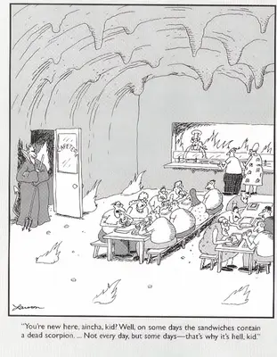 Cik bieži jūs domājat vismaz vienu? Jūsu karikatūra ir iestatīta uz elli Apvidū pārsteidzošs Larsona elle bieži izskatās kā darba vide. Tas izskaidro, kāpēc šī karikatūra notiek kafejnīcas ellē. Pēdējais no lietotājiem ir visgrūtākais veids, kā ellē iegūt bezmaksas ēdienu, bet ēdiens ir aprīkots ar mirušajiem skorpioniem. Visu kļūdu pieņemšana ir dumpīga, un ir kaislīgi domāt par kauliņiem tikai caur domām.