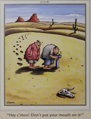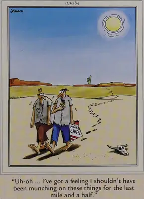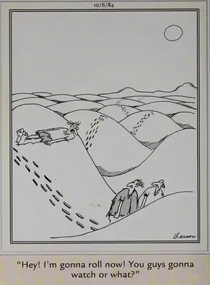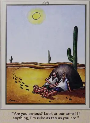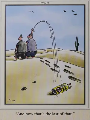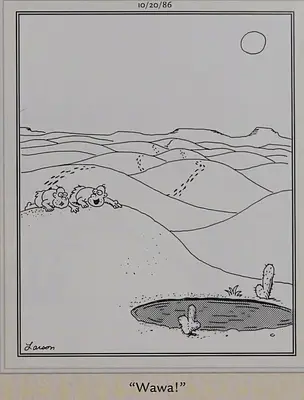 Acīmredzot ir dumjš humoristisks Gerijs Larsons. Tumšā redzesloka situācija tuksnesī nav izdzīvošanas cerība. Šajā karikatūrā sešas smilšu kāpas tiek uzvilktas uz karikatūrista patentētajām pēdām, kas vairāk izplatās paneļa attālumā. Bet viens no trim zaudējumiem, kas izmisīgi zaudēti, neļaus viņa sarežģītajām situācijām padarīt viņu par prieku.