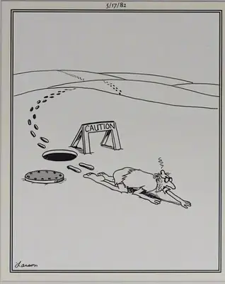 Bet vai ir viegli padarīt šo joku īpaši interesantu? Atbilde: Larsona unikālā āda. Pastāv steidzama problēma, jo notekūdeņi ir steidzama problēma un tāpēc, ka vīrieši viegli neatšķiras no metodes, kā izvairīties no caurumiem. Lasītāji var atspoguļot ticamākus fotogrāfijas skaidrojumus, bet ne labākus. Humors Gerijs Larsons ir balstīts uz noslēpumainu nenoteiktību par jokiem.