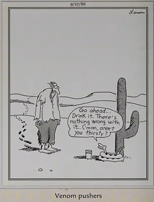 Tas tā ir Larsonam ir narkotiku tirgotāju stereotips. Veneno stūmējs Čūskas mēģina radīt nogurušas apskates objektus. 。 '' Tagad ... vai tu neesi sauss? 'Serke Siss. Senza dubbio, c'è una potente metafora che l'artista può estrarre da questa battuta, anche se il lettore non lo fa. Noņemiet sānu Tā nolēma saņemt atbildi no lasītājiem, tā vietā, lai vienkārši nosūtītu ziņojumu, bet dažreiz nolēma neizstrādāt un noformēt atbildi, ka tas ir svarīgāks karikatūrās.