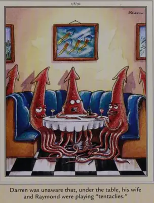 è Noņemiet sānu Mango astoņkāji kontrolē līdzsvaru starp smieklīgām detaļām un telpu. Apvidū Faktiski tā ir smieklīga karikatūra, ka Gerijs Larsons var atrast jutīgus jautājumus par humoru par šo tēmu.