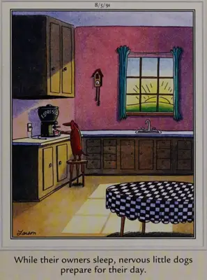 Suns, kurš rīkojas kā cilvēks, ir viens no viņiem. Noņemiet sānu's Gerijs Larsons ir vispopulārākās sacīkstes, un daži suņu veidi šajā panelī ir ļoti aktīvi. Tas apzīmē nelielu desu suni, kas stāv uz pēdas, un kļūst par tasi kafijas, kas izteikta rītausmā.