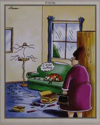 šodien Noņemiet sānu Klasiskā klasika, sieviete, kas atgriežas mājās Viņa mājdzīvnieks ar mājdzīvnieku tika nogādāts būrā ar dinamītu, un kaste joprojām izplatās uz grīdas kā kaķa māja, kas apmierināta ar dīvānu. , Pūš galvu. Es neko nezinu 。 ''