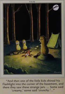 Daudzos gadījumos Gerijs Larsons atstāja vairāk jautājumu nekā atbilde. Noņemiet sānu sāļš, the humor stems from the opposite tactic; what makes it a classic joke is that readers can easily figure out where this horror story is headed, much more quickly than the characters in the cartoon, as the two young peanuts are about to be traumatized when they find out what is in the jars.