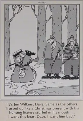 Izvade ir svarīga visu komēdiju iezīme, un Gerijam Larsonam ir īpaša spēja. Normāls un pārveidotājs dažās skandāla situācijās Noņemiet sānu brīdis . Šajā gadījumā Larsona daudzgadīgie putni skāra putnus un piespieda tos uz dubultās līknes vietu, un lasītāja vēders stingri smējās.
