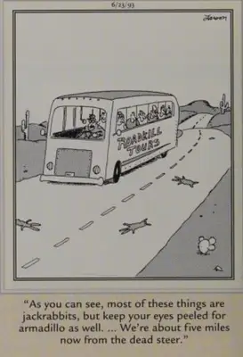 Dīvaini komercuzņēmumi bija atšķirīgi Noņemiet sānu Skavu un ceļa nogalināšanas tūre, es noteikti esmu viens no dīvainajiem Gerija Larsona piemēriem. Šajā panelī Līderi ved autobusu uz tuksnesi un pazīst viņus. Lielākā daļa no viņiem Tas nozīmē, ka ķermenis ir izkaisīts ietvē. Uz Džeka trusis Urinēt pēc Armadilo 。 ''