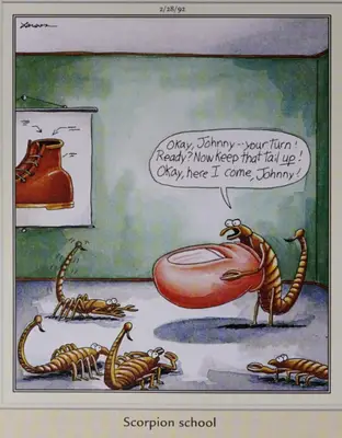 Subtitri Skorpiona skola , 'a Noņemiet sānu Mangai ir raksturīga šī a training class for baby scorpions in which an instructor holds up a giant fake (at least, presumably) human toe, preparing them for a potential encounter with a barefoot human Būtībā.