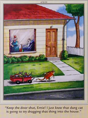 Viens Noņemiet sānu's Gerijs Larsons, lielākais klasisko vārdu pārtraukums, nodrošina unikālu lēmuma interpretāciju. Pārbaudiet, ko kaķis skrien Apvidū Protams, sakāmvārdi nāk no faktiskā kaķa rīcības, bet laika gaitā sarunvalodas organizācijas nozīme tiek pieņemta bez burtiem. Larsons sūta viņu burtiski un staigā pāri viņai. Kaķis velk automašīnu, kas pilna ar grauzējiem un rāpuļiem, lai pārliecinātos, ka kaķis ir ceļā, jo viņa sieva brīdina savu vīru. .