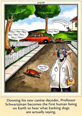 Tas tiešām pārsniedz laikus Noņemiet sānu Manga nekad netiek uzskatīta par vienu no lielākajiem Gerija Larsona. Tajā zinātnieks parāda savu jauno izgudrojumu. Dodieties uz Periferijas ielu ar gatavu ķiveri, kas pārvērš suņa apvalku par cilvēka runu, lai uzzinātu, par ko visi suņi runā. Ey. '