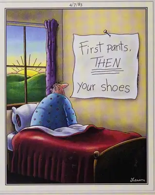' Pirmās bikses Jūsu kurpes Izlasiet piezīmi ar vīrieša gultu blakus vīrieša gultai. Ja jūs pamostaties rītausmā no rīta, no pirmā acu uzmetiena -Stripas humors nāk no fakta, ka notis ir briesmīgas un briesmīgas. Šī apmācība ir ļoti vienkāršs pamats drēbēm no rīta, un notu lielums nepārprotami ir ezotērisks vīrietis, kurš viņu ignorē.