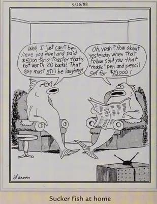 V den Komiksu Vairāk zivju sēž viesistabas pēdējā krēslā, un katra no tām ir tikko ietekmēta. ; Viens nopirka piecus lielus bērnus tosterus, bet otru divreiz. Klosteris un zīmuļa maģija Apvidū Šeit Larsons atspoguļo to cilvēku ciešanas, kuri ir kļuvuši par iekšējo debašu absurdu, ekonomisku un briesmīgu valodu.