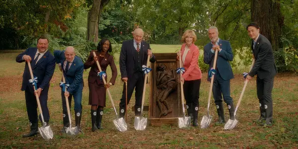 Keita Blanšeta zvaigznes melnā komēdijā, kas bagāta ar politisko satīru, un pastāv iespējas, kur skatīties baumas teātros vai mājās straumējot.