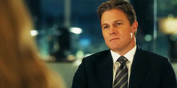 Lekss Skots Deiviss kā Erica Rollins stāvēja virs Braiena Grīnberga kā Riks Dodsens pie sava galda uzvalkos