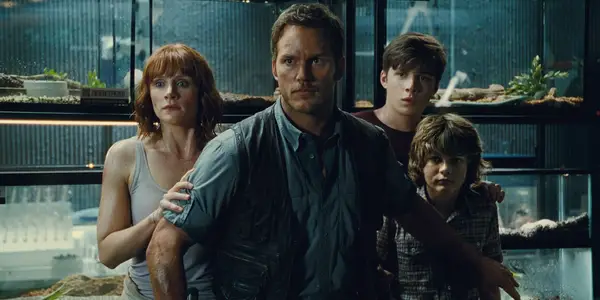 Owen aizsargājot Klēru un bērnus Jurassic pasaulē